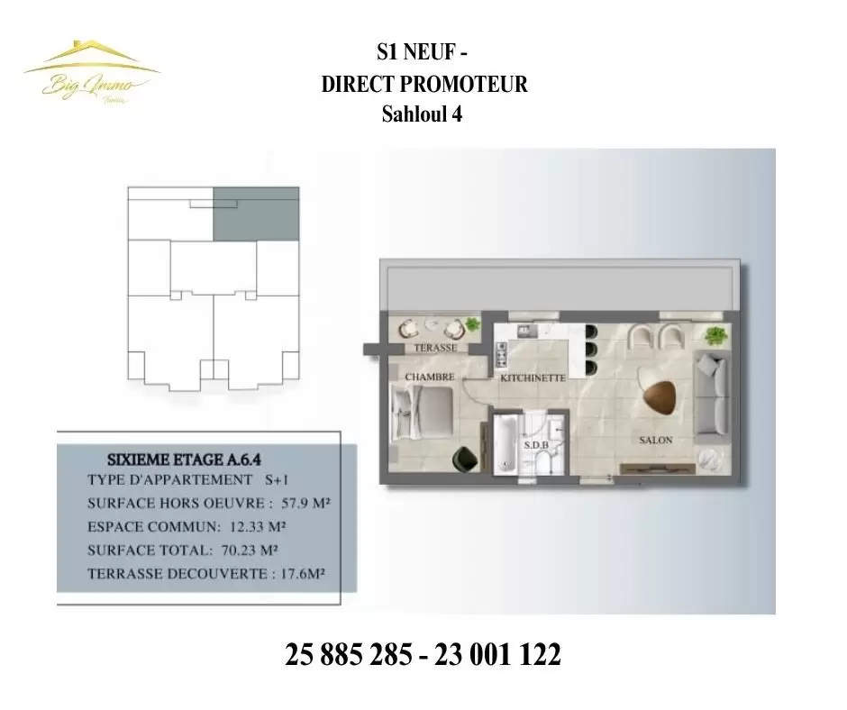 À VENDRE – Appartement S+1 neuf à Sahloul 4 – Direct promoteur À vendre chez Big Immo, un superbe appartement S+1 neuf, situé au sixième étage d’une résidence haut standing à Sahloul 4, proche de toutes les commodités . ✨ Atouts : Salon lumineux avec kitchenette moderne Chambre avec dressing et accès à la terrasse Salle de bain contemporaine Chauffage central dans toutes les pièces Grande terrasse privative Appartement neuf – Direct promoteur Contactez-nous dès maintenant pour plus d’informations ou pour planifier une visite : 25 885 285 / 23 001 122 Vous pouvez aussi nous contacter directement sur WhatsApp !