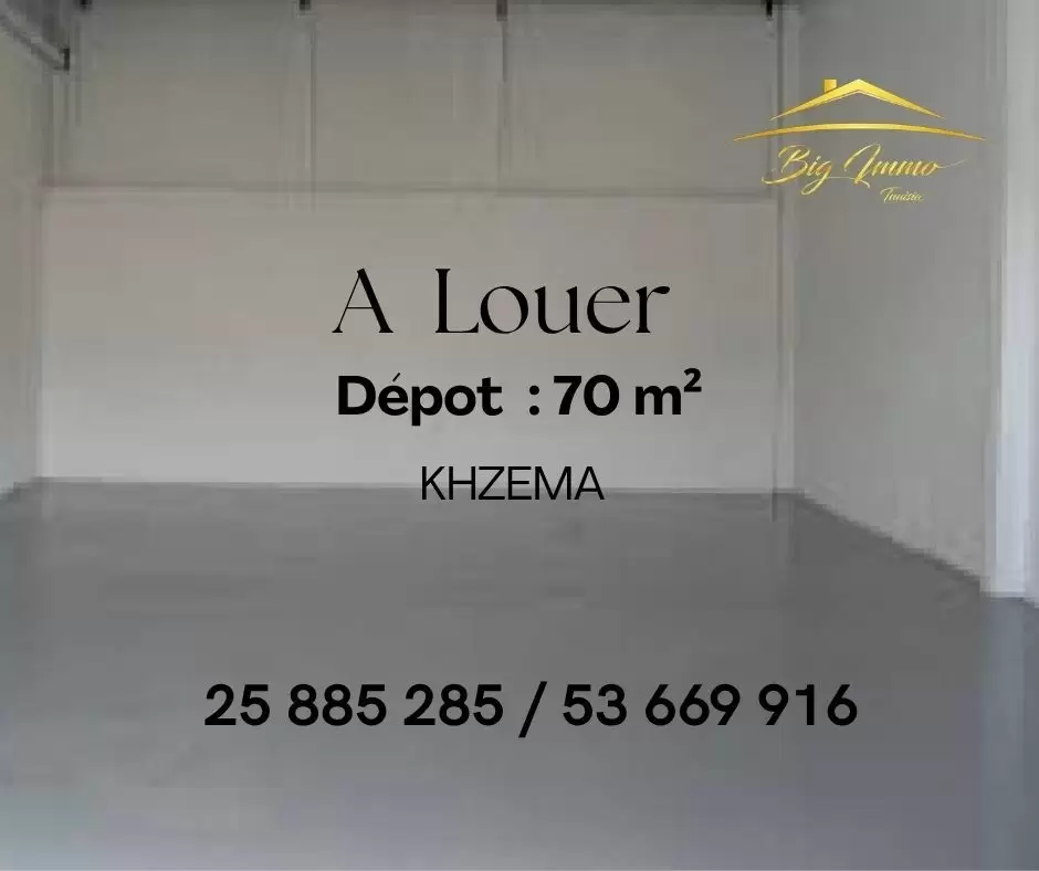 À louer – Dépôt de stockage à Khzema Ouest Dépôt de stockage à louer situé à Khzema Ouest, destiné exclusivement au stockage. Aucune activité commerciale n’est autorisée. Superficie : 70 m² Usages possibles : Stockage de marchandises/Dépôt pour matériel professionnel/Archivage de documents /Stockage pour e-commerce /Dépôt pour équipements, meubles ou cartons Atouts : Grande superficie offrant une excellente capacité de stockage , Quartier sécurisé et bien situé , Solution économique pour optimiser votre espace Contact pour visite : 25 885 285 / 53 669 916 . N’hésitez pas à nous contacter pour plus de détails ou pour planifier une visite.