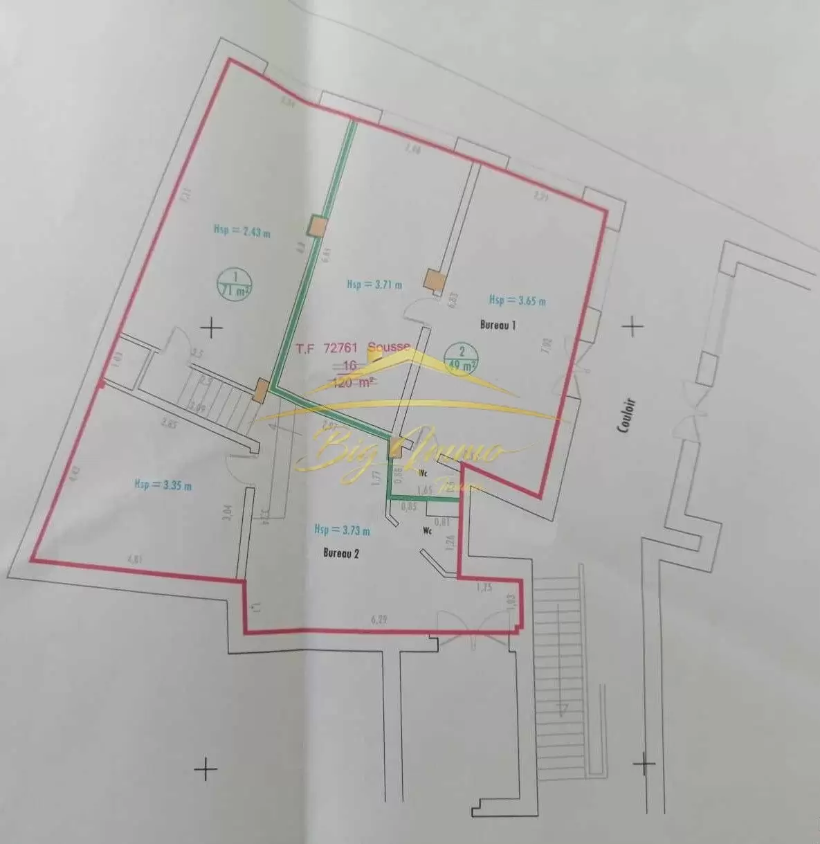 Chez BIG IMMO ! En plein centre-ville de Sousse, 02 bureaux à vendre proches de toutes commodités ainsi que des transports, de très haut standing au Réez de chaussé d'un immeuble . le premier bureau traversant d'environ 50 m² vous offre une salle d'attente lumineuse, 01 pièces, point d'eau. prix de la vente : 260.000 TND le deuxième bureau est d'une superficie de 70 m² vous offre (A+2) une salle grande d'attente , 02 pièces, point d'eau. prix de la vente : 280.000 TND. Titré , à usage uniquement bureautique ( cabinet, assurance, société, ....) . Pour plus d'informations, veuillez contacter : Mr Wajdi souayah : 94.81.84.84 // Mlle Eslem 53669916 // Mr Brahim 29 300 900 // Adresse Email : bigimmotunisia@gmail.com Agence Immobilière Big Immo Tunisia, Khezama Ouest , Rue Hassan Ben Said Sousse, près de librairie SIAB 4051 Sousse. Votre confiance est notre réussite !