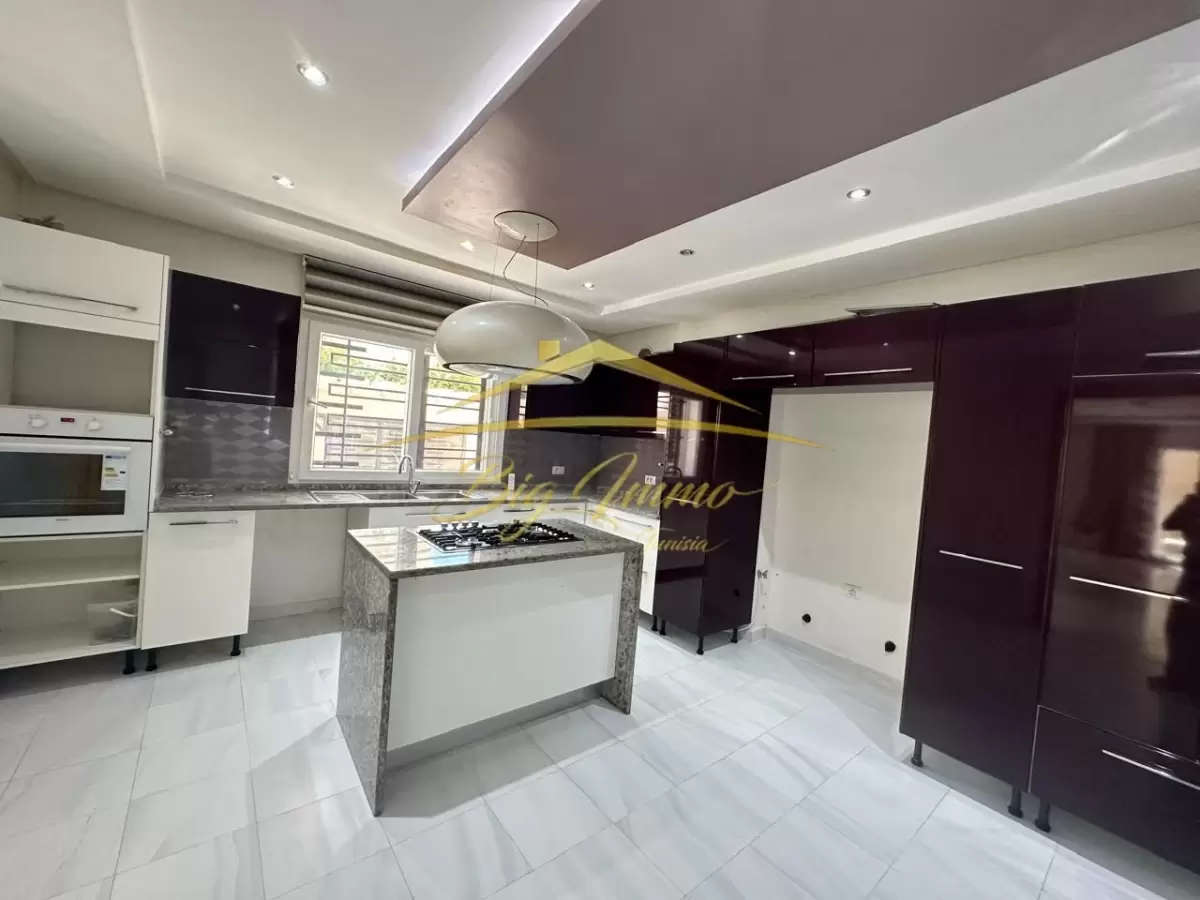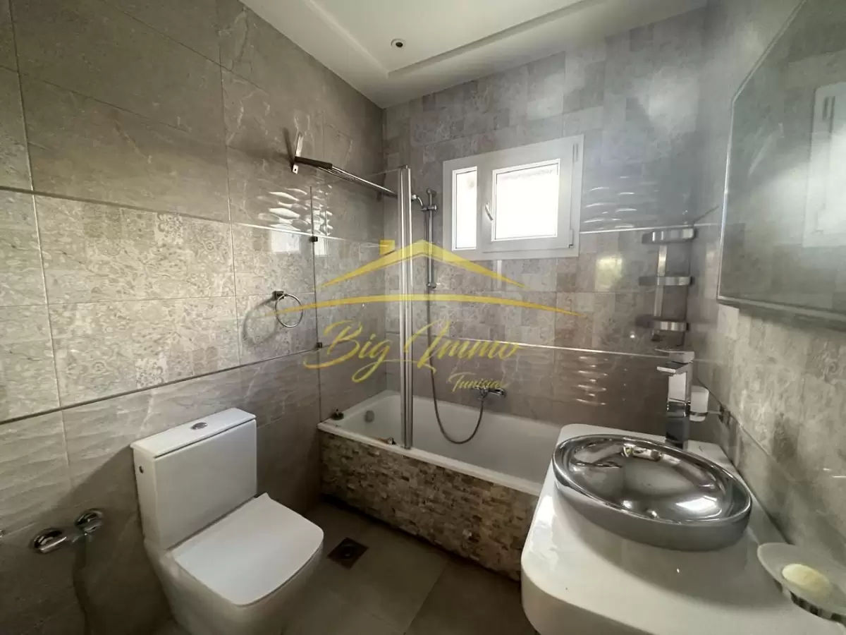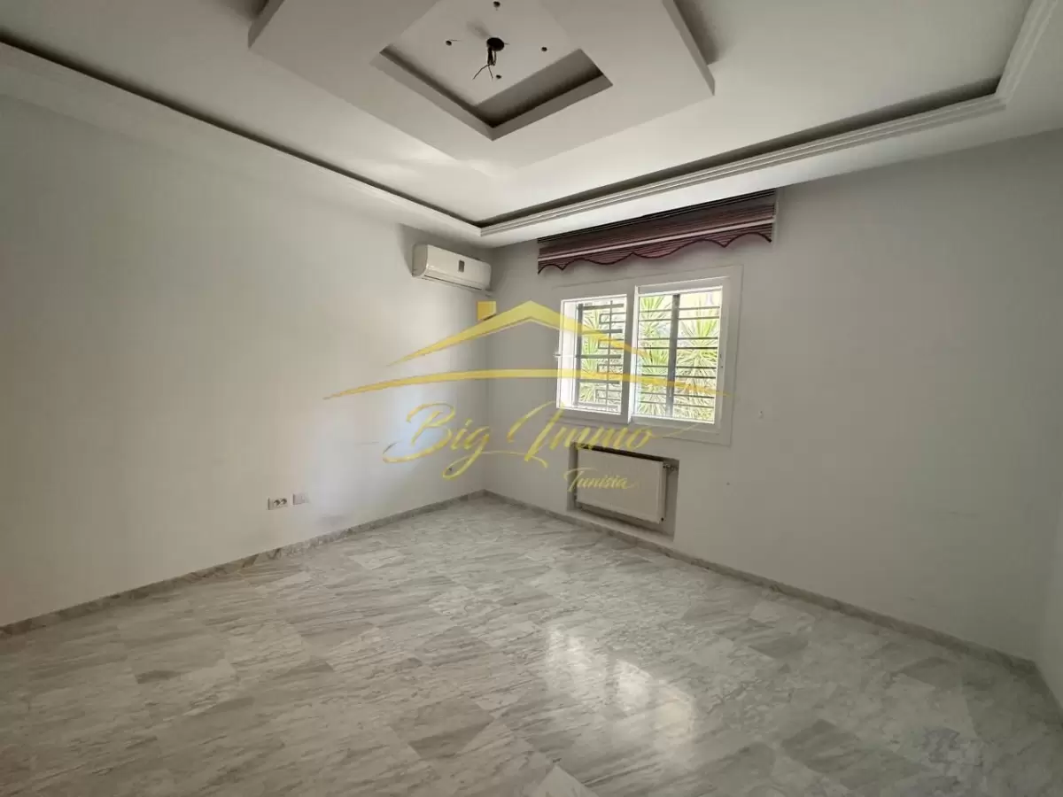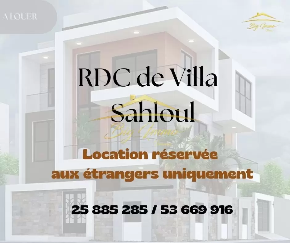 À LOUER – Rez-de-chaussée de Villa Haut Standing à Sahloul Situé dans un quartier résidentiel calme, ce bien bénéficie d’une entrée totalement indépendante et d’un jardin privé. Location réservée exclusivement aux étrangers. Caractéristiques principales : Rez-de-chaussée d’une villa indépendante Entrée privée avec espace pour deux voitures Jardin privatif arboré Composition intérieure : Salon spacieux et lumineux Cuisine moderne entièrement aménagée Suite parentale comprenant : • Chambre à coucher • Chambre dressing • Salle de bain avec cabine de douche Deux chambres pour enfants Deuxième salle de bain avec baignoire Placard encastré dans le couloir Séparation bien pensée entre l’espace jour et l’espace nuit Atouts : Idéal pour un couple ou une petite famille étrangère recherchant le calme, le confort et l’indépendance. Contact : Pour plus d’informations ou pour organiser une visite privée, veuillez appeler le : 25 885 285 / 53 669 916