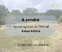 À vendre : Terrain agricole de 7 800 m² avec 2 studios – Kalaâ Kebira, Sousse Excellente opportunité pour les amateurs de calme et d’investissement en pleine nature. Superficie : 7 800 m² Terrain : Façade clôturée par un grillage métallique Titre de propriété : Titre individuel Libre de toute hypothèque Infrastructures : Poteau électrique à l’intérieur du terrain Robinet d’eau potable Dépendances : Deux studios aménagés Arbres et plantations : 70 oliviers adultes Arbres fruitiers variés et récents Prix : 60 DT / m² Pour une visite ou plus d’informations : 25 885 285 / 53 669 916